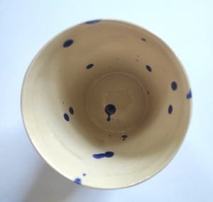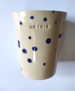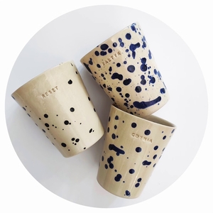 KUBEK CERAMICZNY BEZ UCHA, szkliwiony, chlapany, wypalany w wysokiej temp., można myć w zmywarce. Każdy egzemplarz ma swój niepowtarzalny, nakrapiany wzór w kolorze czarnym.